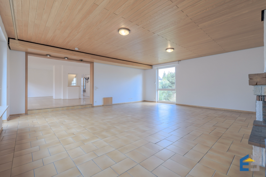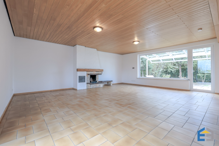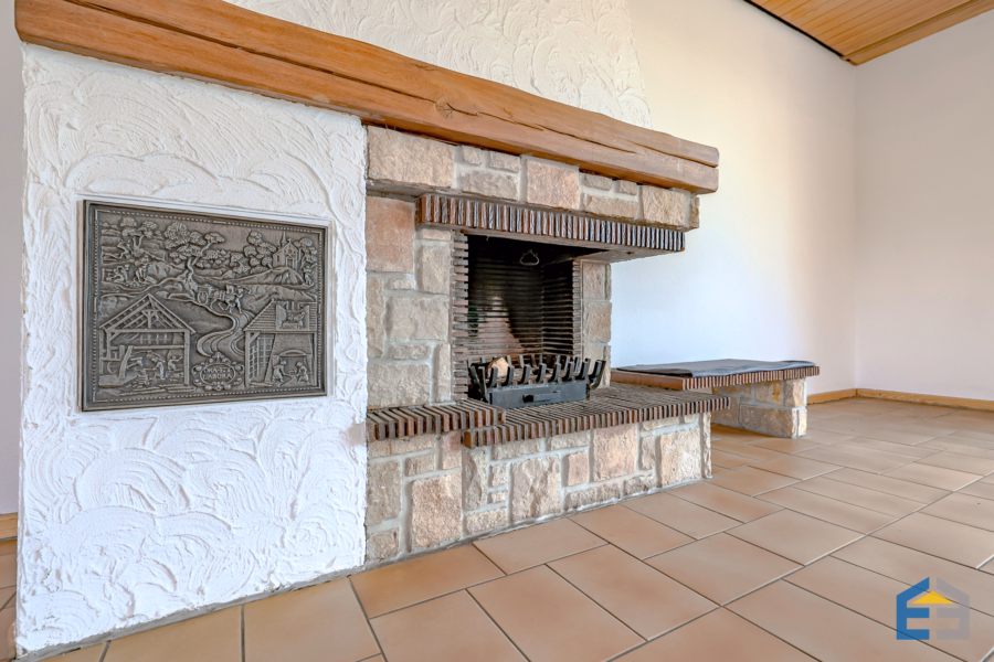 Das Herzstück ist der großzügige Wohn- und Essbereich mit seinem offenen Kamin – hier knistert es nicht nur im Feuer, sondern auch im Familienleben. Von hier aus gelangen Sie auf die überdachte Terrasse mit Blick in den weitläufigen Westgarten, wo Kinder unbeschwert spielen und Eltern entspannen können.