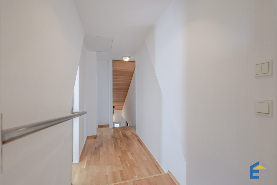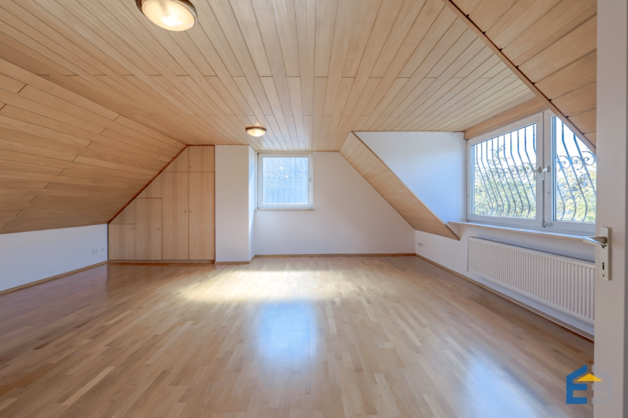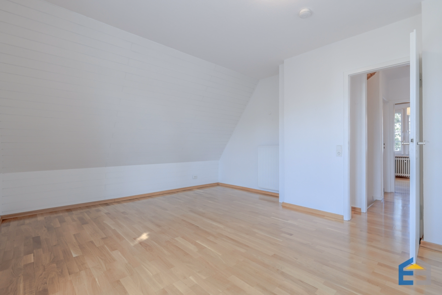 Das Obergeschoss bietet drei gut geschnittene Zimmer – ideal als Kinder-, Eltern- oder Arbeitszimmer – ein zweites Tageslichtbad mit Bidet, eine praktische Abstellkammer und einen Balkon mit Gartenblick.