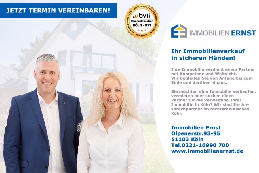 Bitte senden Sie uns Ihre Kontaktdaten (Name, Anschrift, Telefonnummer und E-Mail Adresse) per E-Mail an service@immobilienernst.de oder rufen Sie uns an unter☎ 0221-16 990 700.