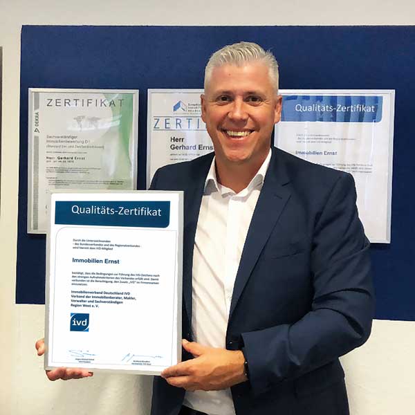 Immobilien Ernst ist Mitglied des Immobilienverbandes Deutschland IVD und berechtigt, den Zusatz „IVD“ zu nutzen. Durch den Bundesverband der Immobilienwirtschaft und den Regionalverband der Immobilienmakler, Makler, Verwalter und Sachverständigen Region West e.V. wurde Immobilien Ernst die Erfüllung der strengen Aufnahmekriterien des Verbandes bestätigt.
